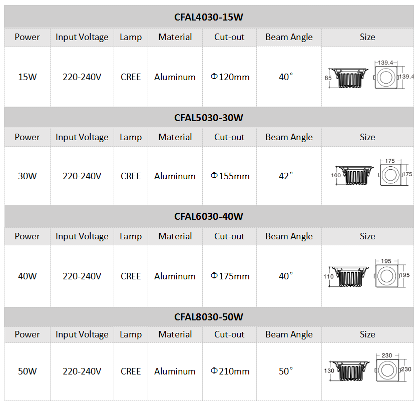 • Each size have circular flat shell,circular inner arc shell and square flat shell.Simple atmosphere,Fine surface electrostatic spray,In the structural design of hte radiator using separate rotary cassette, and between the ring and the heat sink surface a safety line, in order to ensure safe and reliable open face ring subsequent replacement of hte light source modules.