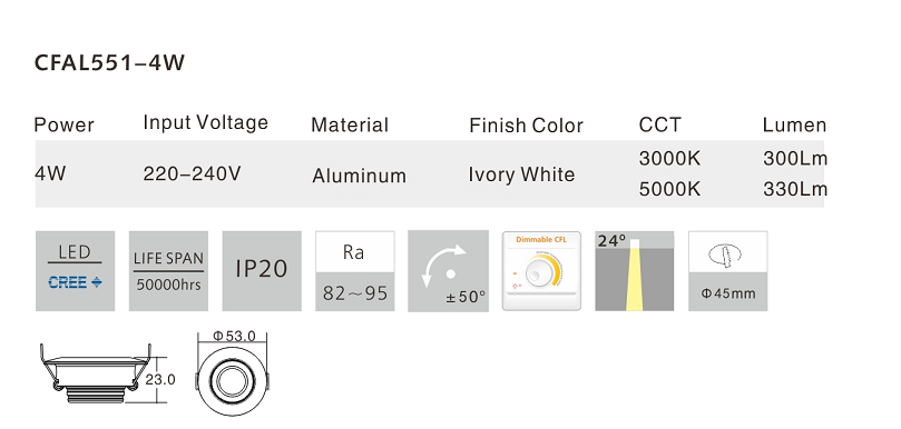 ■This series adopts imported Cree COB LED chip. ■COB LED module can be able to install on the heat sink to improve the heat transfer. ■Good color rendering, low light declining and 100000 working hours for LED lightsource. ■Driver with TUV certification, high power factor and complete protection function, 50000 working hours for driver. ■The cob module is equivalent to the point source, combined with the accurate optical design from Colorful, meet the space lighting of fixed and oriented point. Moreover, perfectly replaces the traditional MR11, MR16 lamp and ceiling lamp.